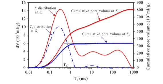 核磁共振 T2 譜:本文測試了樣本在三種狀態(tài)下的核磁共振 T2 譜:(1)洗油并110℃干燥后;(2)正十二烷飽和-So;(3)正十二烷離心-Soir。洗油干燥樣本的 T2 譜代表巖石顆粒表面的束縛水和粘土層間緊密結(jié)合的羥基水。So和Soir狀態(tài)下的 T2 譜需要減去干燥樣本的T2譜。