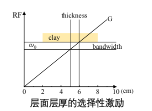 與CPMG序列只采集整個(gè)樣品的數(shù)據(jù)相比,恒定梯度選層序列通過(guò)施加層面選擇梯度場(chǎng),即選擇性射頻脈沖,可以獲得沿樣品軸線(xiàn)方向各層的分層CPMG數(shù)據(jù)。如圖為恒定梯度選層序列的脈沖時(shí)序圖。在測(cè)試中,不同位置上的核磁共振信號(hào)在梯度線(xiàn)圈產(chǎn)生的梯度磁場(chǎng)作用下,產(chǎn)生不同的定位信息,利用數(shù)學(xué)轉(zhuǎn)換解碼,就可以將核磁信號(hào)分配到每一層的位置上,核磁共振的一維定位包括層面和層厚的選擇,層面和層厚的選擇性激勵(lì)原理如下圖所示。